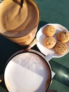 Als Nachtisch gibt es einen Frappé, serviert mit leckeren Keksen.