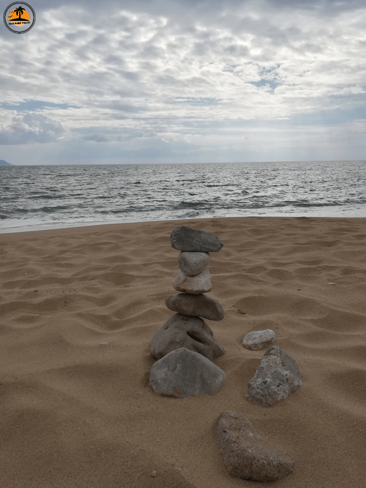 Der Weg hat sich auf jeden Fall gelohnt. Der Strand ist wunderschön, der feinste Sand, den wir bis jetzt auf Kefalonia gesehen haben. Vor uns ist noch ein weiteres Auto angekommen, dass sich aber bald verabschiedet. Wir genießen die Stille, die Sonne, das Rauschen des Meeres und den feinen, weißen Sand zwischen unseren Zehen.