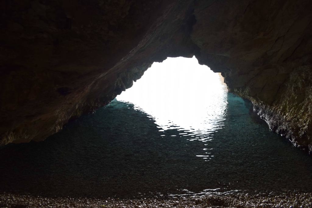Zum Glück entpuppt sich des Rätsels Lösung als eine kleine Höhle mit eigenem Strand, die aber zum Meer hin offen ist. Der Mann ist einfach rausgeschwommen. Eine schöne Entdeckung und ein tolles Motiv. Schade, dass wir keine Zeit haben, bis zum Sonnenuntergang zu warten, das Licht wäre dann dort phantastisch. Wir wollen jedoch die Küstenstraße noch bei Tageslicht befahren und müssen auch noch packen. Es heisst also Abschied nehmen vom Dafnoudi Beach.