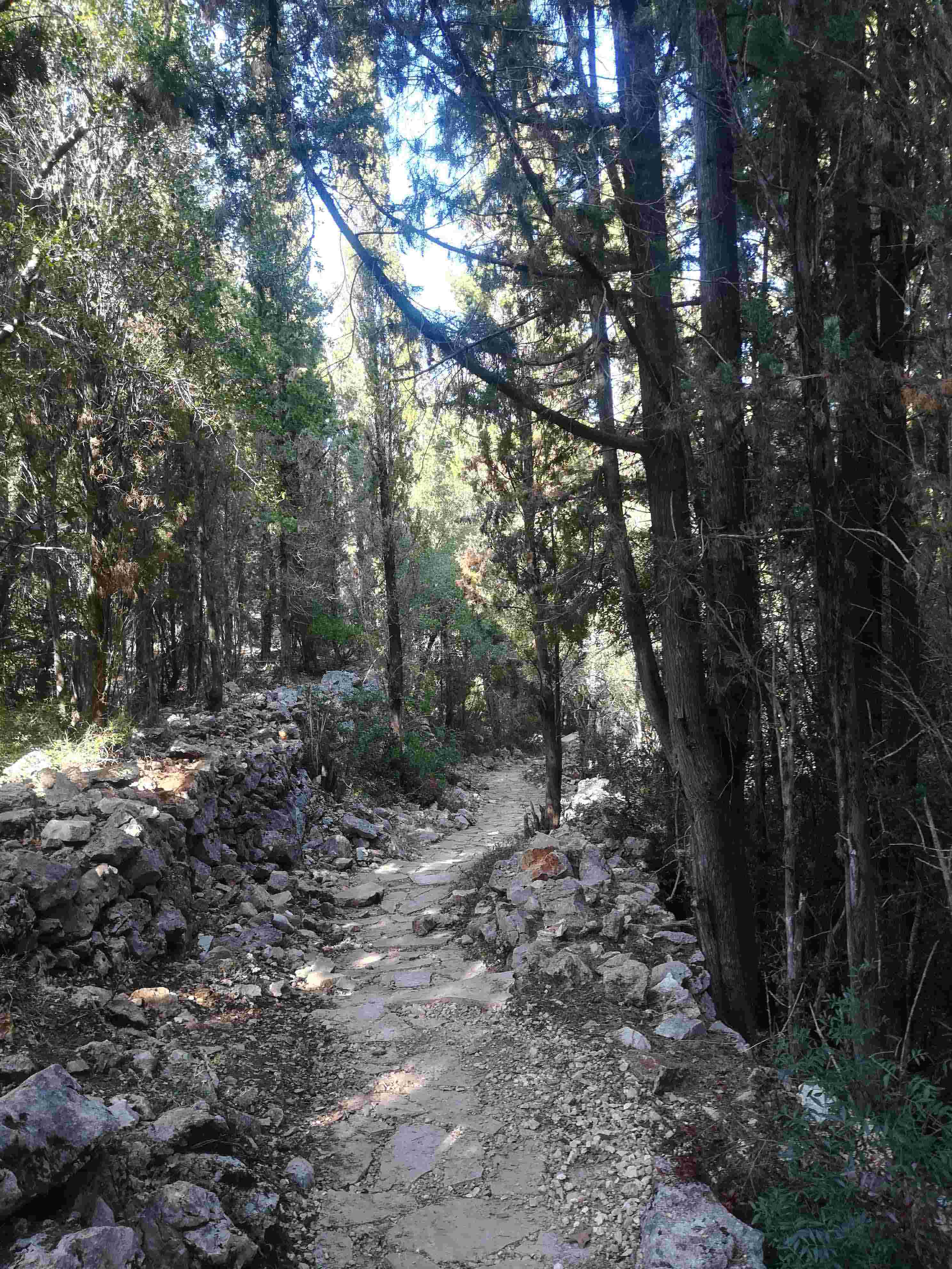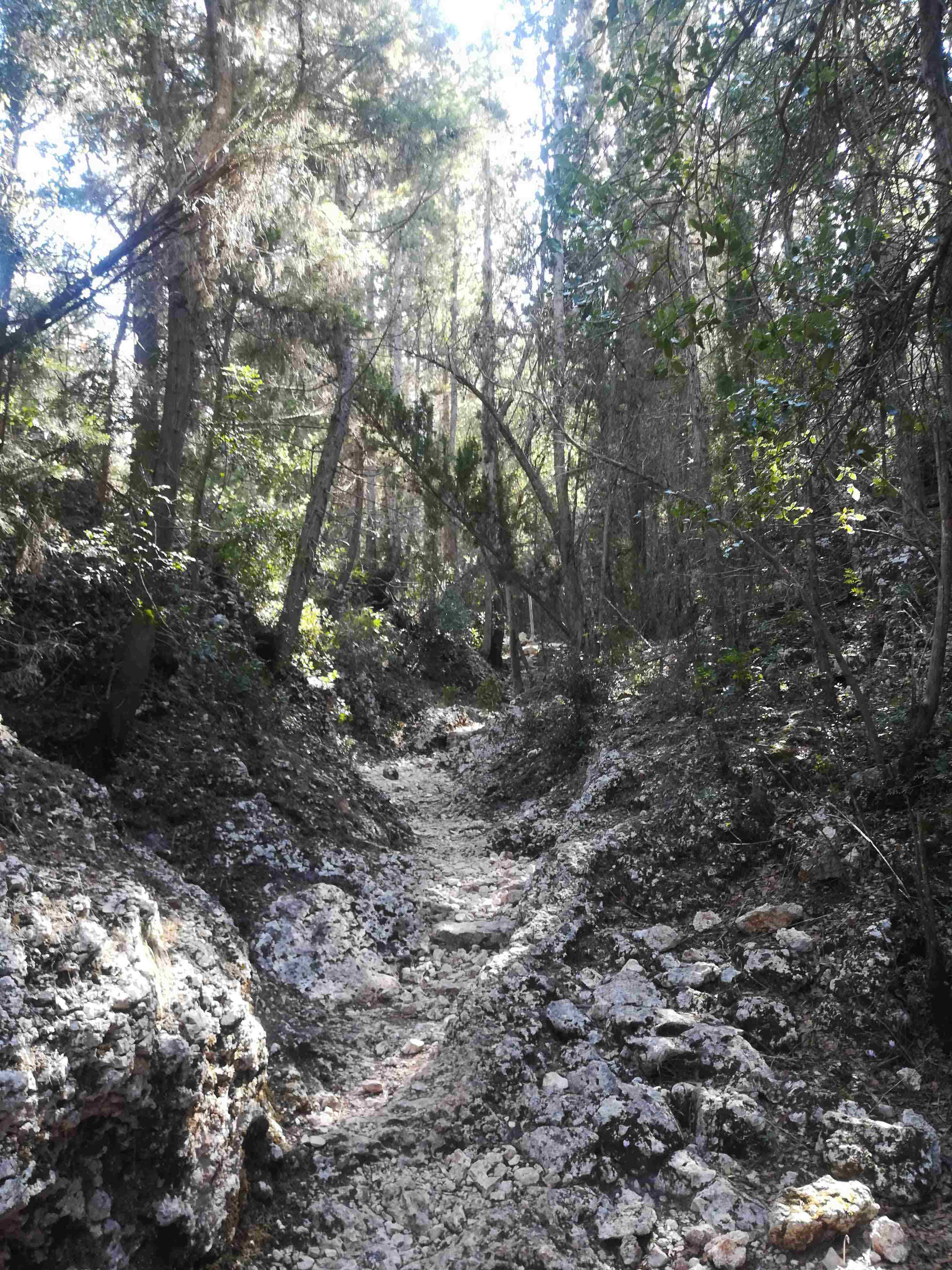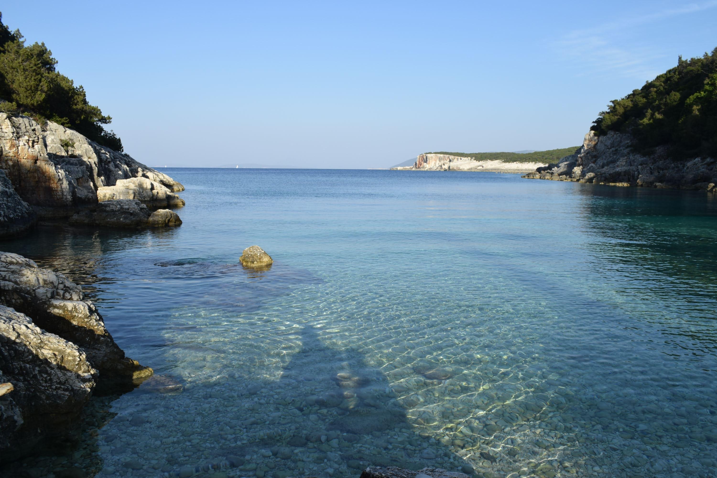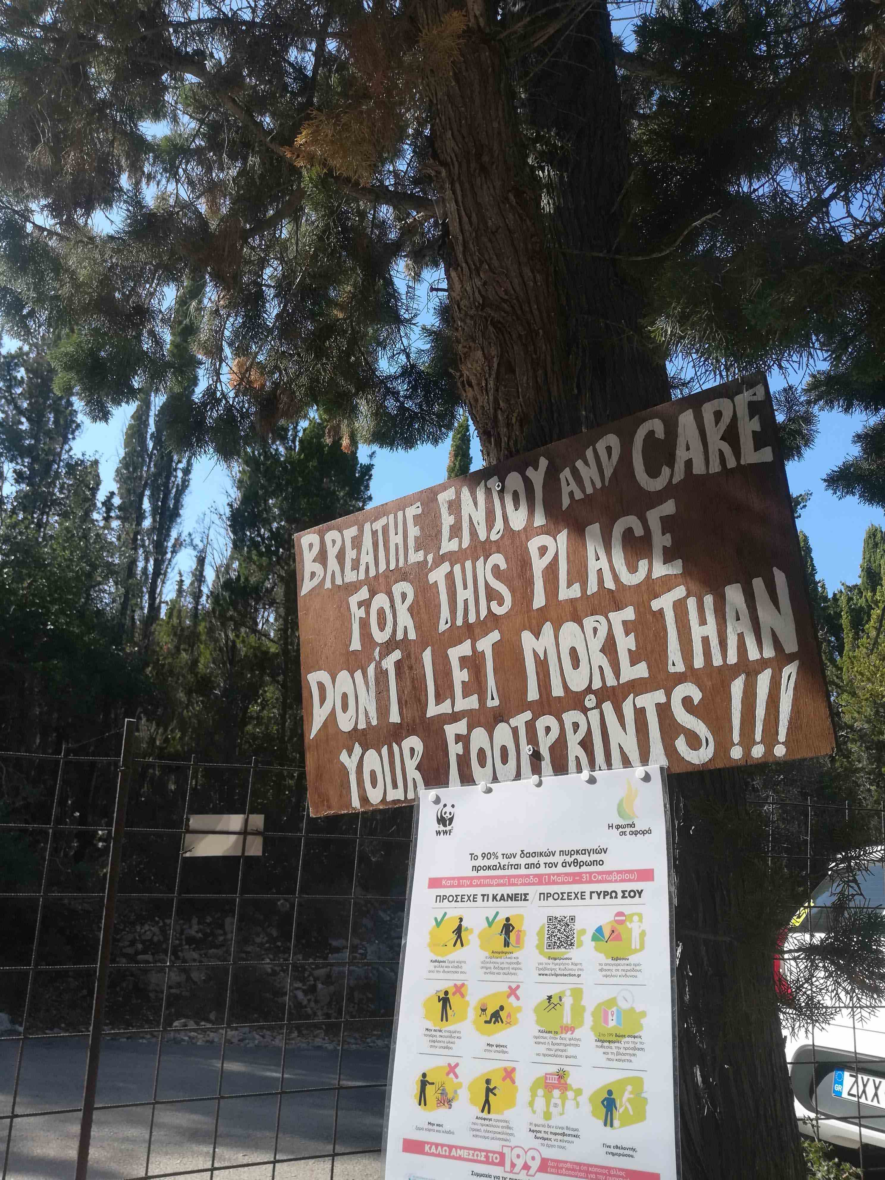 Von unserem Auto aus führt ein Trampelpfad in den Wald, entsprechende Schilder weisen auf den Strand hin. Besonders gefällt uns der Hinweis, doch bitte seinen Dreck wieder mitzunehmen. Der Weg (gestrichelte Linie bei Maps) ist recht abenteuerlich und stellenweise steil. Eher nichts für Invaliden oder kleine Kinder. Nach ca. 20 Minuten Kraxelei weitet sich der Weg zu einem Kiestrand in einer herrlichen tiefen Bucht.