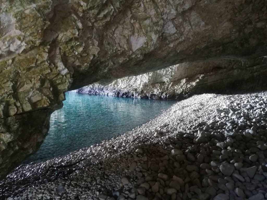Als wir schon kurz vorm Einpacken sind, sehen wir einen Mann in einer Felsspalte auf der rechten Seite des Strandes verschwinden. Er geht gebückt hinein und kommt einfach nicht wieder !