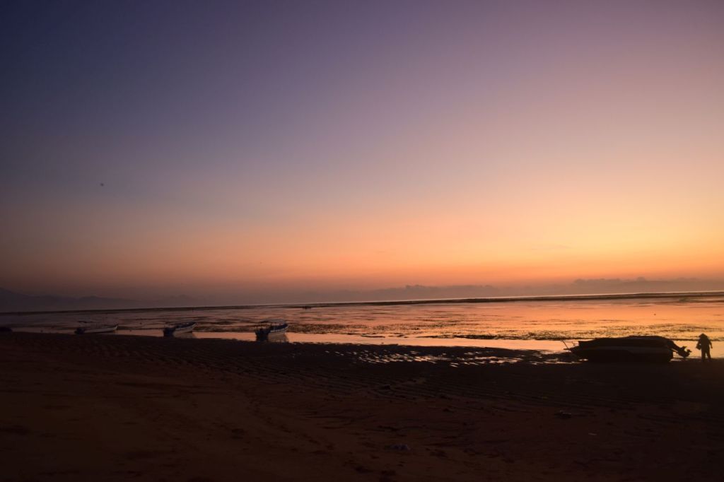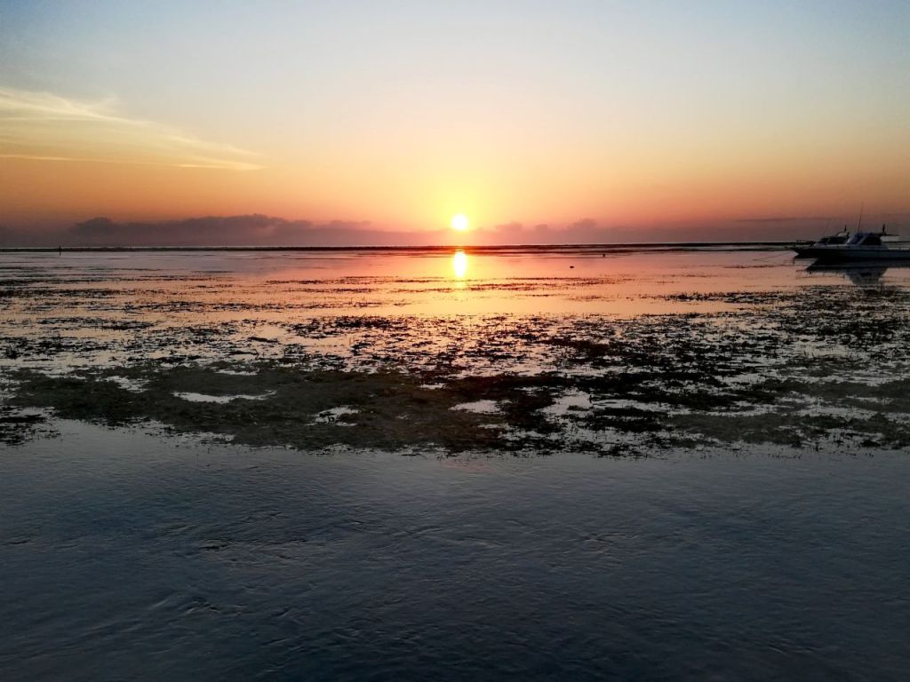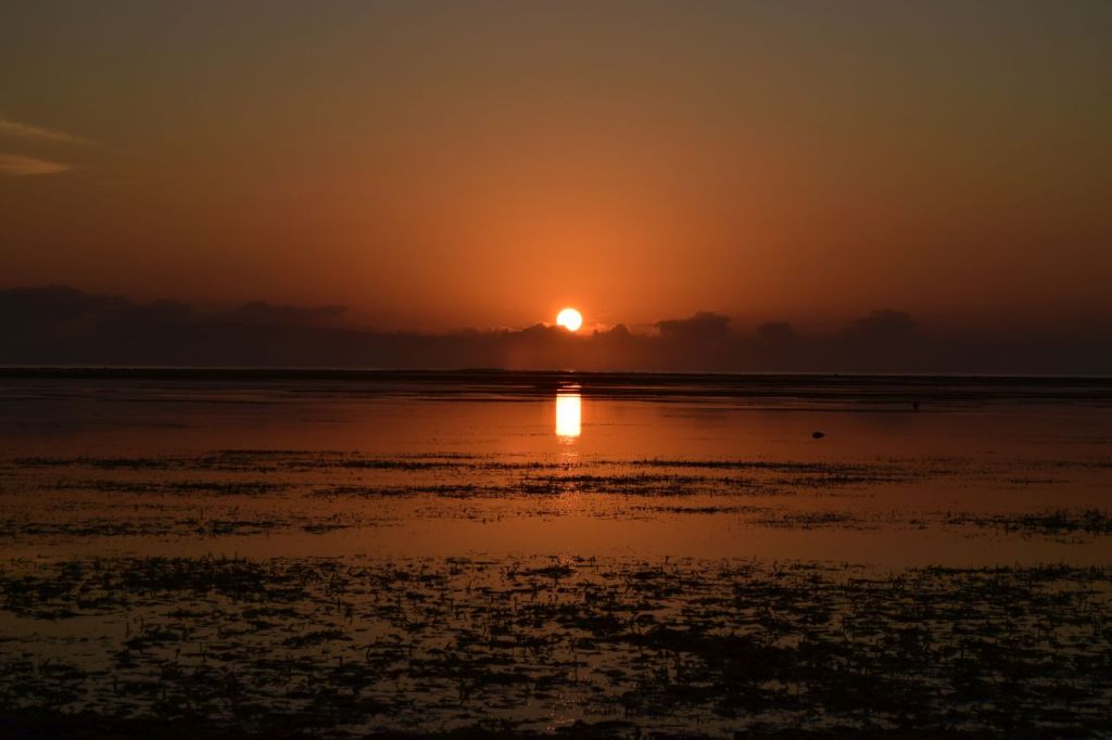 Wir warten in meditativer Stille, dass die Sonne erscheint, ein leichtes Glimmen ist schon zu sehen. Es ist Ebbe…die Wellen im Sand, die das Meer hinterlassen hat, treten im Zwielicht deutlicher hevor. Und plötzlich ist es soweit, ein rot-oranges Rund bricht förmlich über den Horizont und verwandelt das Watt und das entfernte Meer in einen roten Spiegel. Phantastische Farben, man meint zu spüren, wie die Welt sich räkelt und langsam erwacht. Wie ihr an der Bildern seht, hat sich unser frühes Aufstehen gelohnt und wir können bestätigen, dass es sich um einen der schönsten Sonnenaufgänge der Insel handelt! Wir geniessen gemeinsam diesen besonderen und schönen Start in den Tag.