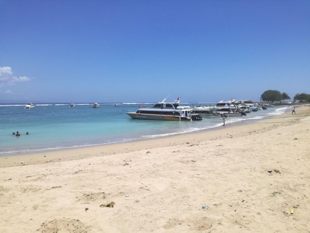 Am „Hafen“ angekommen, sind wir erstmal erstaunt, dass es diesen eigentlich gar nicht gibt. Direkt neben einem hässlichen 80er Jahre Hotel befindet sich der wunderschöne Strand, an dem die Boote nach Nusa Lembongan und Nusa Penida anlegen. Und zwar am Strand…direkt am Strand. Das man sich nasse Füße holt, wussten wir zum Glück bereits.