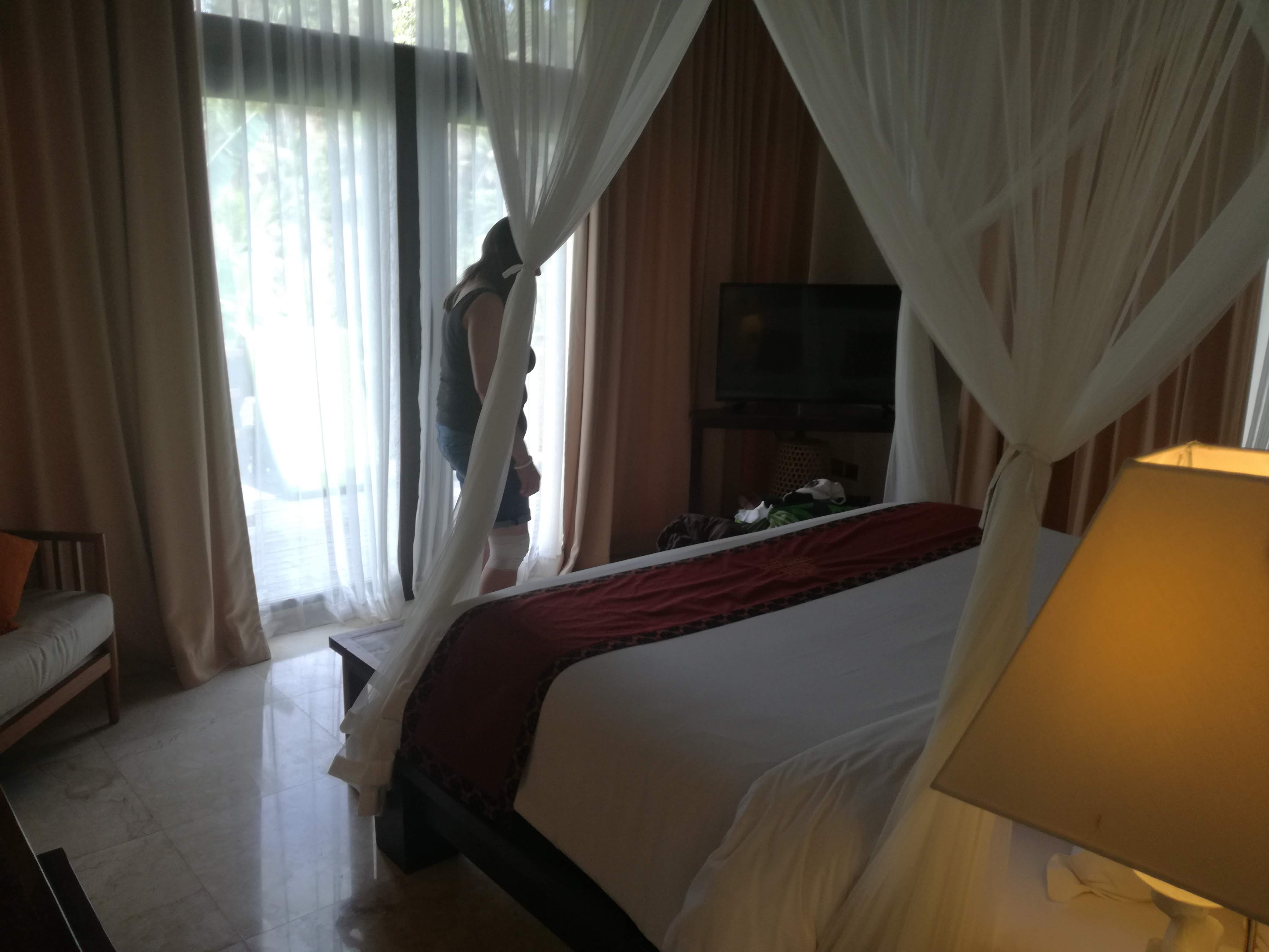 Wir werden mit einem „Golfcar“ zu unserem Zimmer gefahren. Nach wenigen Sekunden wir uns klar warum – die Wege sind wirklich verdammt steil. Definitv nichts für Lauffaule oder gar Invaliden. Wer Probleme mit Steigungen hat, sollte woanders unterkommen. Man kann sich zwar auch jedes Mal mit einem Golfcar hoch- oder runterfahren lassen, muss dann aber halt Wartezeiten in Kauf nehmen.