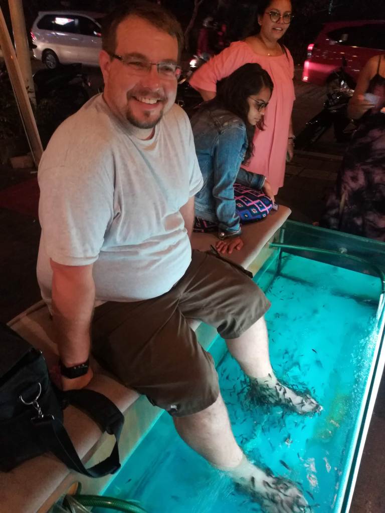 Da wir noch etwas Zeit haben bis unser Shuttle kommt, besucht Sascha das erste mal in seinem Leben ein Fish-Spa. Gott, wie das kitzelt…aber was macht man nicht alles für gepflegte Füße.