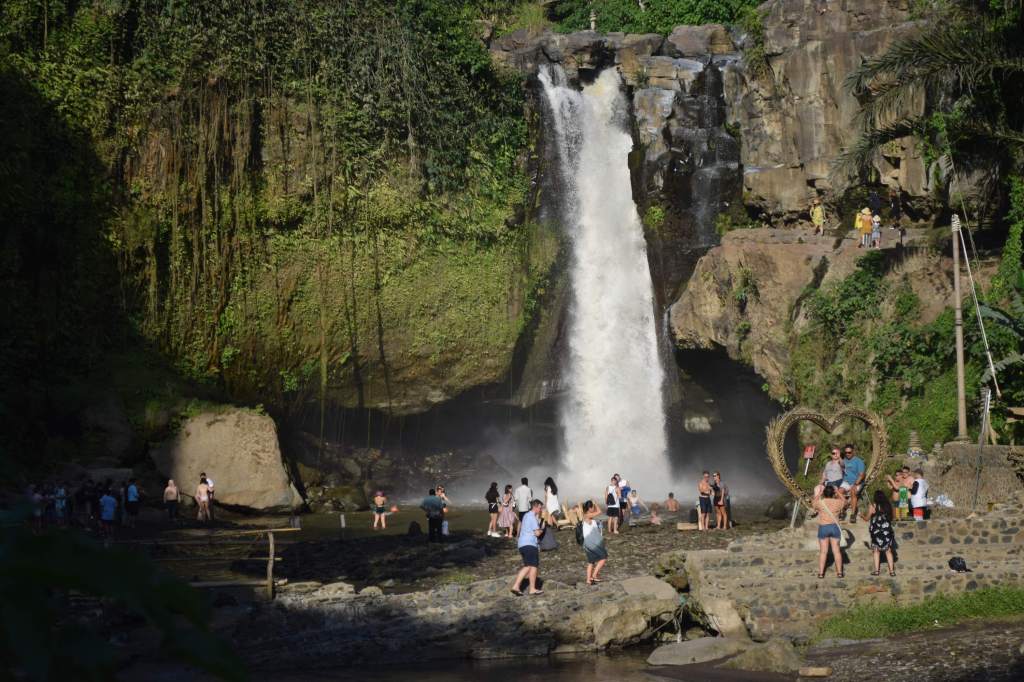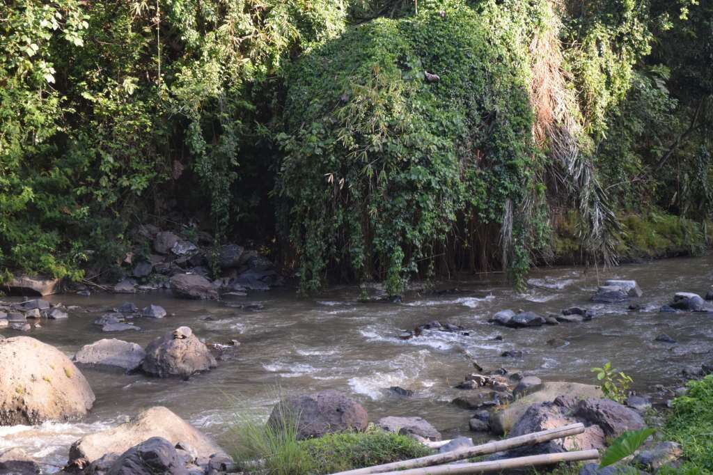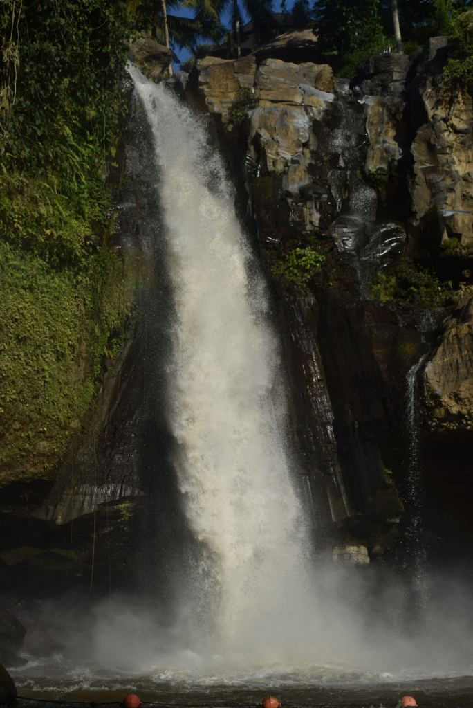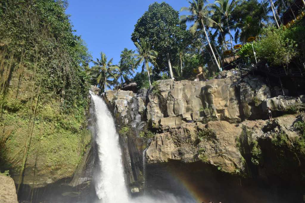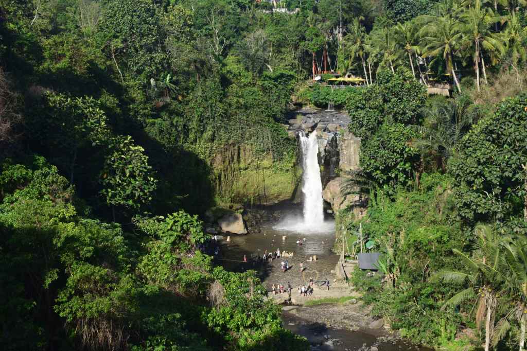 Nach einem kleinen Mittagssnack machen wir uns an den Abstieg zum Tegenungan Wasserfall. Steile, hohe Stufen führen nach unten, alles mit Geländer. Wer jedoch nicht gut zu Fuß ist, sollte den Anblick von oben geniessen.