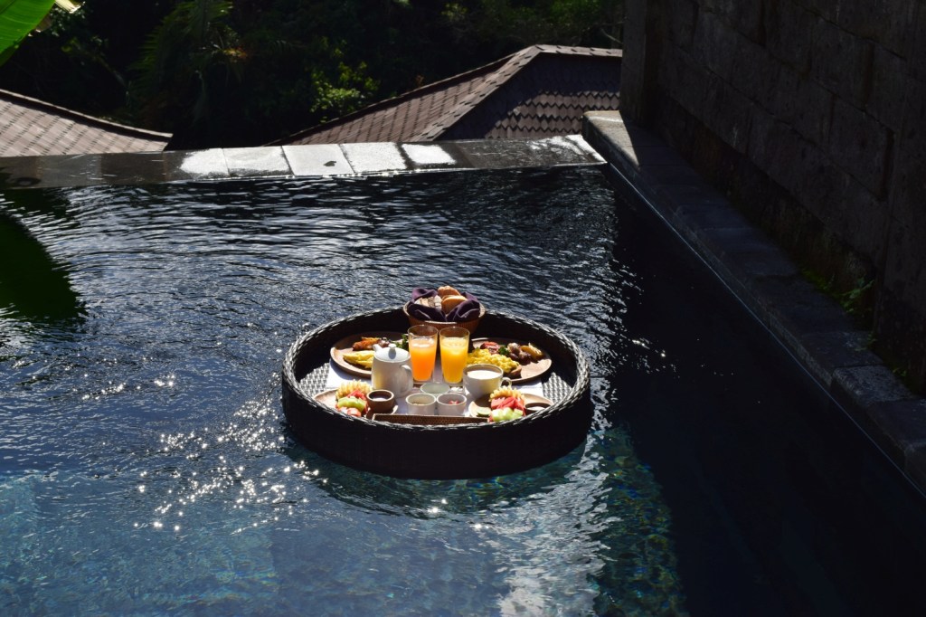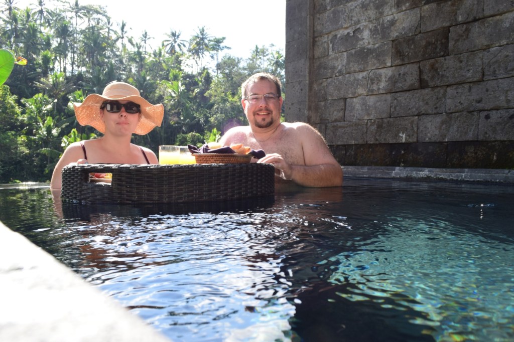 Der Tag beginnt mit Sonne und da Uschi heute Geburtstag hat, gönnen wir uns ein Floating Breakfast, das auf Bali in vielen Hotels angeboten wird. Das Tagesprogramm bestimmt sie heute natürlich und für heute Abend ist noch eine Überraschung geplant 🙂