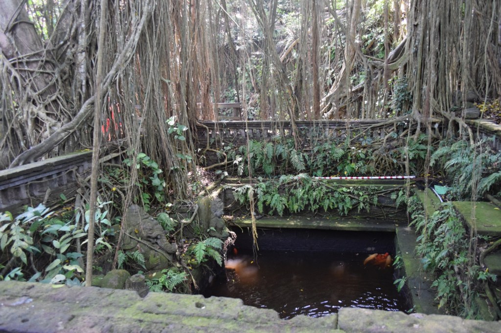 Wir gehen weiter an einem kleinen Tempel mit Wasserbecken vorbei über eine Holzpfad, der hier in den Wald gebaut worden ist und bewundern die Natur und die tolle Lichtstimmung hier im Monkey Forest.