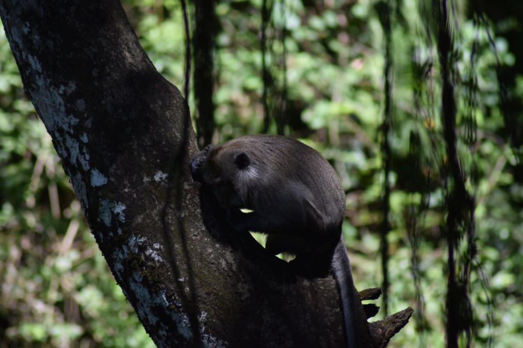 Wir zahlen 2,90€ = 45.000 IDR Eintritt pro Person und betreten den Park. Sofort wird es schattiger – hohe, alte Bäume bilden einen dichten Dschungel. Und nach nur wenigen Meter sehen wir die ersten Javaneraffen. Dies ist die Affenart von der ca. 650-700 Affen hier in diesem Wald leben.