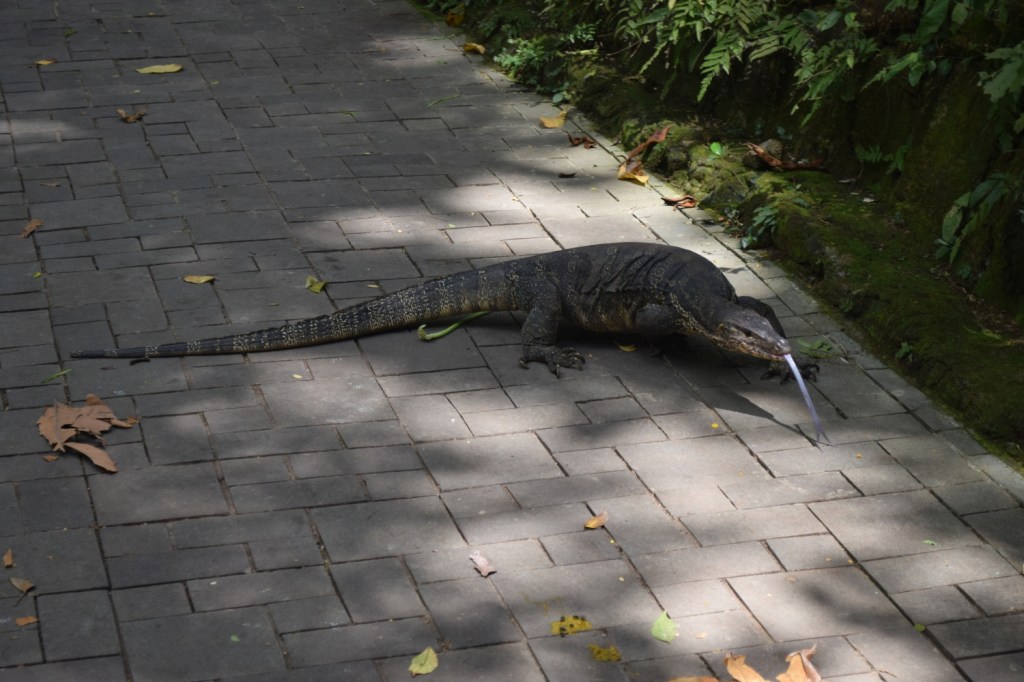 Langsam machen wir uns wieder auf den Weg zurück zum Eingang also uns plötzlich ein ganz besonderer Geselle begegnet. Ein Bindenwaran kreuzt unseren Weg, bevor er sich wieder auf den Weg in den Dschungel macht. Was für eine beeindruckende Echse.