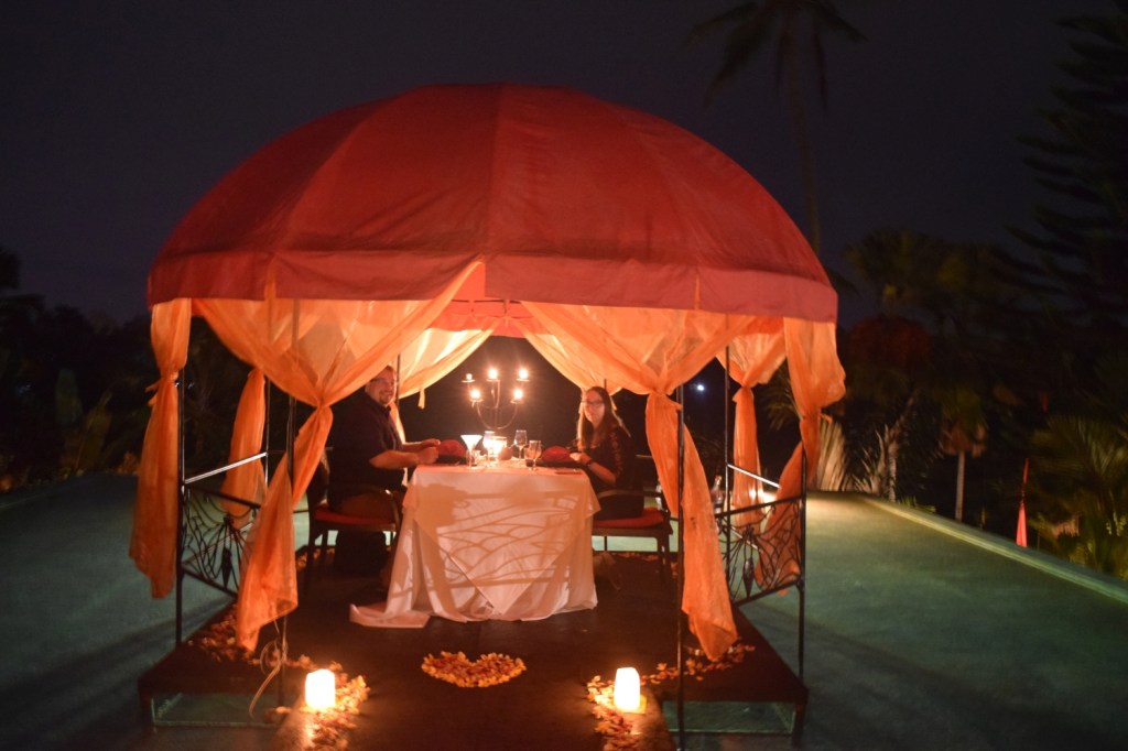 Wir genießen ein 6-Gänge Menü unter dem Sternenhimmel ganz alleine für uns, nur umrahmt vom Wasser des Infinitypools und den nächtlichen Geräuschen des Dschungels. Ein gelungener Abschluss und ein unvergessliches Geburtstagsdinner.