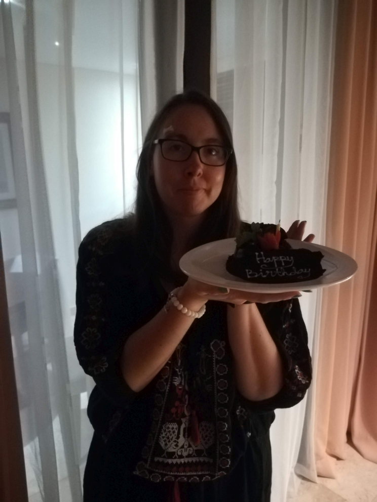 Uschi hat sich noch kaum von ihrer Überraschung erholt, da klopft es auch schon an der Tür. Gleich vier Personen vom Hotelpersonal, die Uschi ein Happy Birthday singen und Kuchen überreichen. Irgendwie ein bisschen peinlich, aber auch ein toller Service. Uschi ist gerührt.