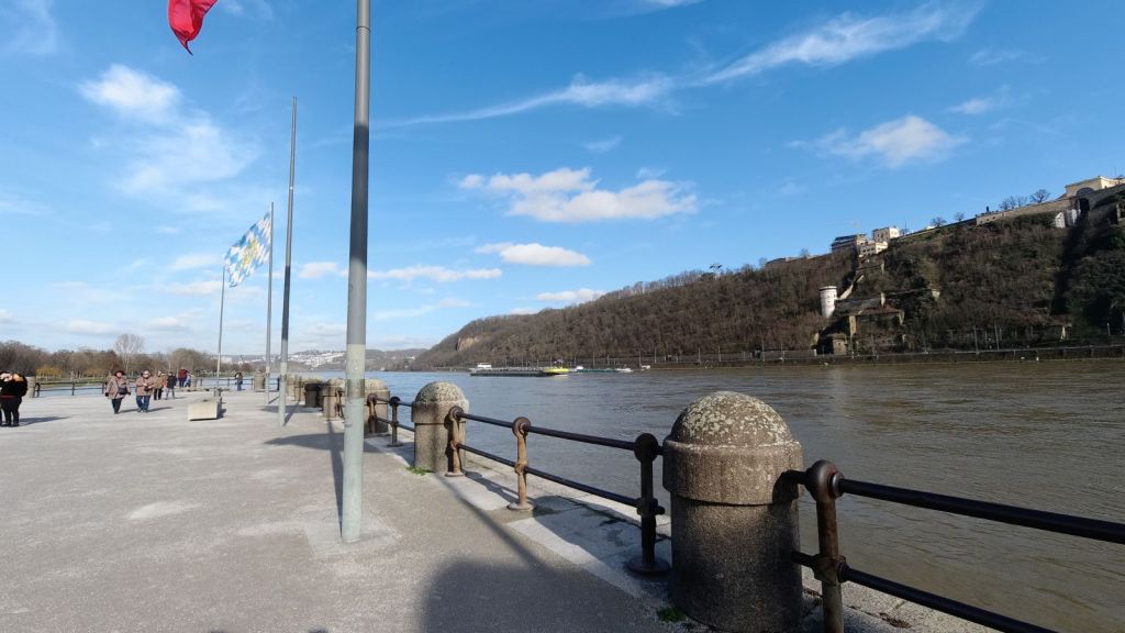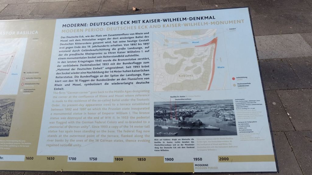 Fun Fact: Das wahre Deutsche Eck befindet sich ein paar Meter zurückgelegen. Dort, wo das Deutschherrenhaus steht, welches heute das Ludwig Museum beherbergt. Das was heute gemeinhin als Deutsches Eck gilt, ist eine künstlich aufgeschüttete Landzunge.
