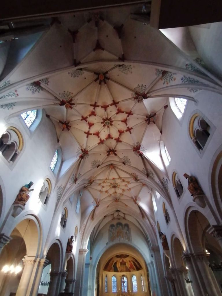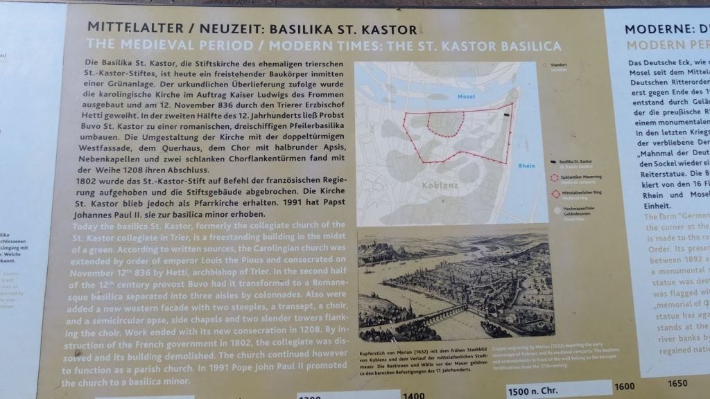 Die Basilika St. Kastor ist die älteste Kirche der Stadt. Bei sanfter Kirchenmusik erkunden wir die Basilika. Hier befinden sich die Gebeine der seligen Rizza. Die Verehrung dieser im 13 Jahrhunder seliggsprochene Dame habe angeblich besonders in und um Koblenz eine lange Tradition. Sie habe ein Stück die Mosel abwärts in Kobern an der Mosel gelebt und sei täglich, wie Jesus, über Wasser (die Mosel) gelaufen, um an der Messe in der Kastorkirche teilzunehmen. Abweichend dazu heißt es in einem Gedicht des Bonner Dichters Karl Simrock „Immer morgens, wenn die Glocken in St. Castors Kirche riefen, schritt sie auf des Rheines Wellen freudig hin, vor Gott zu knien“. Ob sie jetzt über Rhein oder Mosel wandelte, wird uns wohl heutzutage auch niemand mehr sagen können 😉