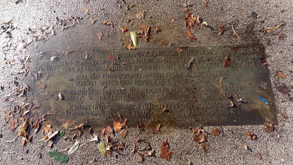 Wirklich hübsch ist der aus Basaltblock bestehende Kastorbrunnen definitiv nicht. Warum wir ihn trotzdem für erwähnenswert halten, ist die Geschichte dahinter: Auf der Seite befindet sich eine französische Inschrift. Diese Inschrift stammt aus dem Jahre 1812 und stammt von Jules Doazan, welcher der letzte französische Präfekt der Stadt war. Der Brunnen sei als Denkmal zur Erinnerung an den napoleonischen Feldzug gegen die Russen aufgestellt worden. Moooooment, werden jetzt vielleicht die historisch interessierten Leser einwenden – da stimmt doch was nicht?? Ja richtig, 1814 (zwei Jahre später also) kamen die Russen über den Rhein und nahmen Koblenz ein. Als der russische Kommandant der Brunnen mit der Inschrift fand, ließ er die Worte „Gesehen und genehmigt durch uns, den russischen Kommandanten der Stadt Koblenz, am 1. Januar 1814“ anfügen.