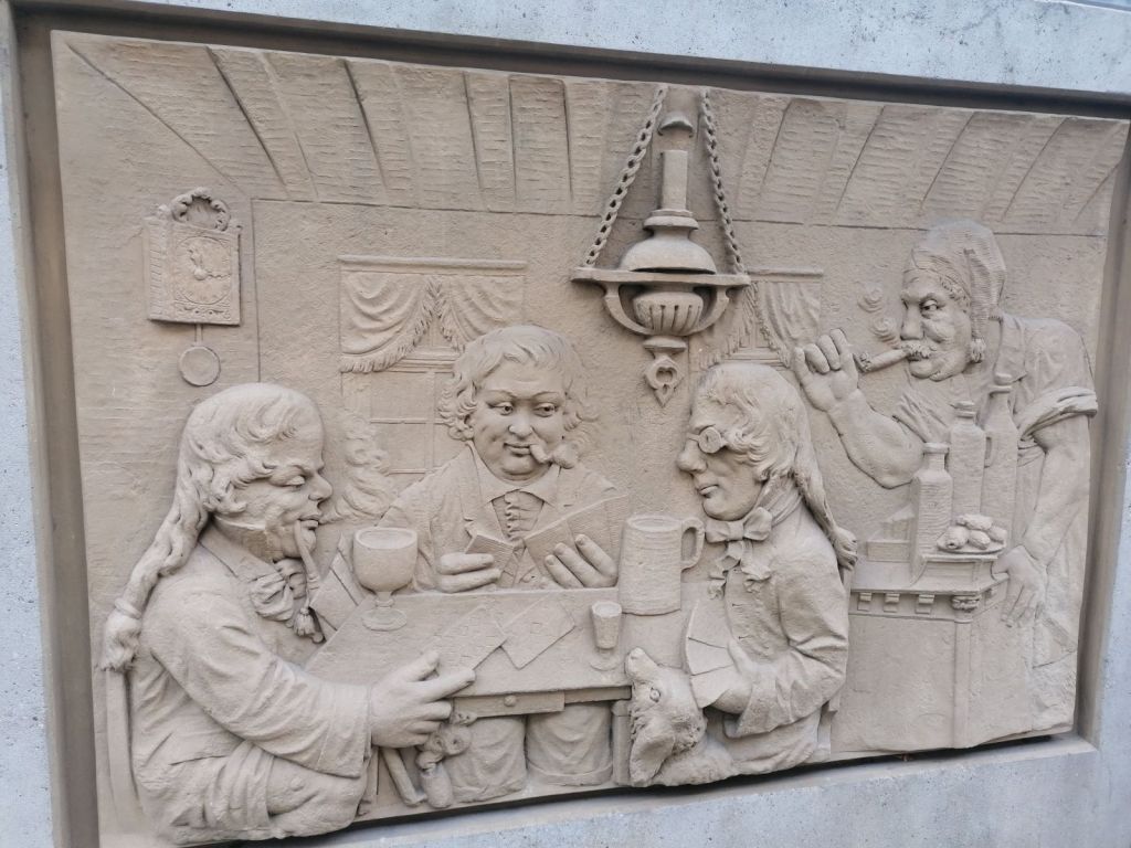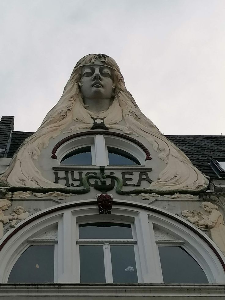 Aber ihr solltet euren Blick beim Rundgang durch die Stadt auch ruhig mal nach oben wenden – besonders wenn ihr vor Hausnummer 11 in der Firmungsstraße steht. Doch könnt ihr nämlich die Göttin Hygiea sehen. Hygiea ist die Göttin der Gesundheit und das erklärt auch, warum sich unterhalb zwei Schlangen befinden, die aus einer Schale zu trinken scheinen – ein typisches Zeichen ihres Vaters Asklepios, Gott der Heilkunst. Links und rechts befinden sich noch zwei Darstellungen von Frauen. Links sieht man eine Schwester, die einen kleinen Jungen an der Schulter behandelt und rechts eine Frau mit eine Baby.