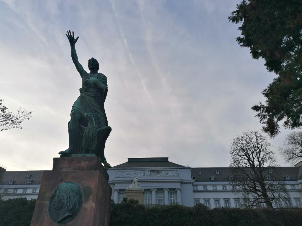Hinter dem Schlossgarten in den Rheinanlage fällt uns eine große (über fünf Meter hoch) Bronzstatue ins Auge. Die Statue stellt Joseph von Görres dar. Der 1776 geborene Koblenzer war Gymnasial- und Hochschullehrer. Zusätzlich war er ein katholischer Publizist und erlangte Bekanntheit durch sein vierbändiges Werk „Christliche Mystik“.