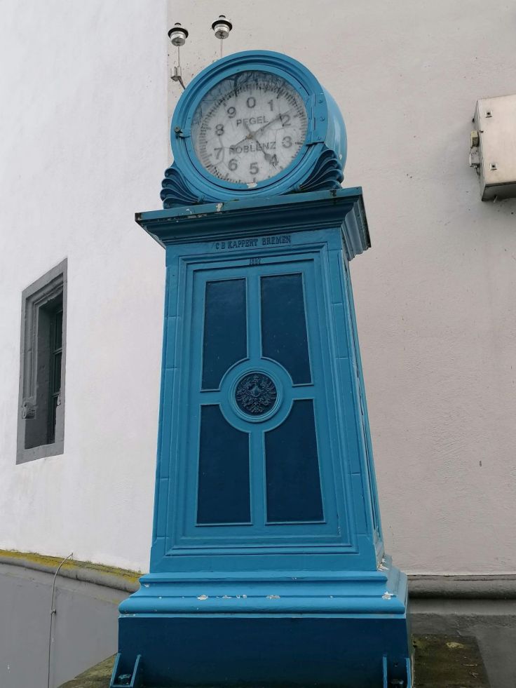 Uschi durfte an der Mosel auch schon die Bekanntschaft mit Hochwasser machen – und spätestens seit diesem Moment war klar: man sollte seinen Pegel immer kennen! Die Pegeluhr von 1887 ermöglicht den Spaziergängern am Rheinufer den akutellen Pegelstand des Rheins zu erfahren. Das kleine achteckige Gebäude nebendran, das Pegelhaus, diente früher dem Be- und Entladen von Schiffen auf dem Rhein. Heute befindet sich hier ein Restaurant mit einer Glasfront zum Rhein.