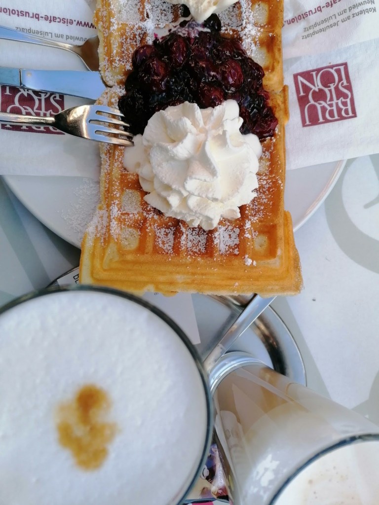 So langsam treibt uns die Lust nach einer Pause in Richtung Innenstadt. Am Jesuitenplatz direkt vor dem Koblenzer Rathaus machen wir Stop im Eissalon Brustolon und gönnen uns das erste Eis des Jahres. So war zumindest der Plan – bis wir einen Blick in die Waffelkarte geworfen haben 😉