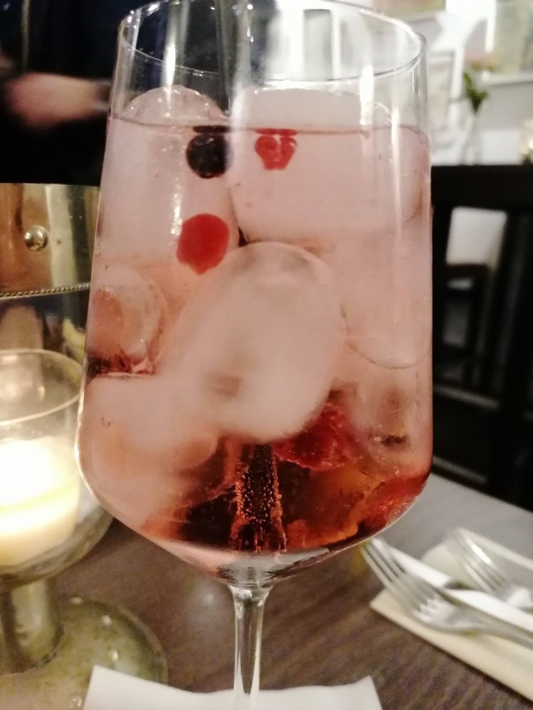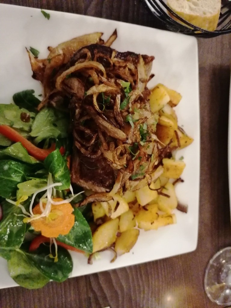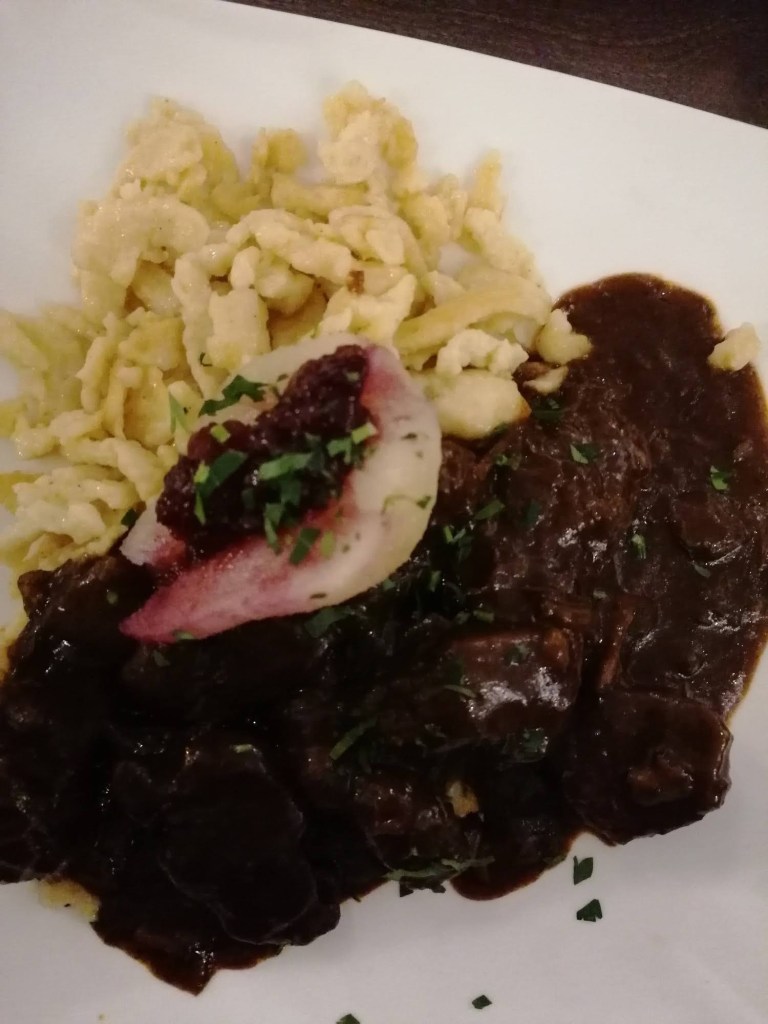 Wir starten mit einem Aperitiv in Form eines Lillet Wild Berry. Köstlich. Und dann schlemmen wir los! Wir starten mit der großen Antipasti Platte. Nehmen sie aber extra nicht für zwei Personen, weil wir schon ahnen, dass die Portion mehr aus ausreichend groß sein wird – und ja, ist sie auch 😀 Während Uschi das heimische Wildgulasch mit hausgemachten Spätzl und Rotweinbirne nimmt, bleibe ich, klassisch, bei einem Rumpsteak mit geschmorten Zwiebeln und Bratkartoffeln. Wir sind mit unserem Essen absolut glücklich und zufrieden. Leider schaffen wir nicht alles – da waren die Augen doch größer als der Magen. Selbst im Nachtischmagen ist ausnahmsweise kein Platz mehr.