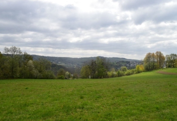 Hier geht es gemeinsam mit anderen Wanderwegen, wie bspw. dem Pilgerweg Schönstatt zwischen Feldern und Pferdekoppeln in Richtung Eitelborn. Ein kleines Trampelpfädchen führt uns direkt unterhalb der ersten Häuser des Ortes entlang. Irgendwie auch nicht gerade ein hübscher Anblick beim Wandern – aber das mag Geschmackssache sein. Wir gehen wandern, weil wir die Natur mögen und die Ruhe schätzen und nicht, um uns die Häuser und Gärten von wildfremden Menschen anzuschauen.