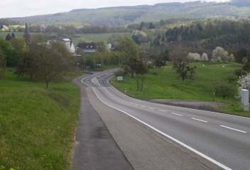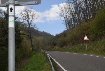 Sanft hügelig geht es vorbei an Pferdekoppeln und Feldern bis wir uns Arzbach nähern. Ein winzig kleines Stück geht es durch Arzbach und dann kommt ein Teilstück, was uns fassungslos werden lässt. Wir schauen x-mal, ob wir noch auf dem richtigen Weg sind, gehen nochmal ein Stück zurück, aber wir sind ohne Zweifel auf dem richtigen Weg. Die nächsten Meter führen uns direkt am Straßenrand entlang. Hinter der sicheren Leitplanke können wir nicht gehen, da der Hang direkt dahinter abfällt. Wir drücken uns bei vorbeirasenden Auto- und Motorradfahrern also so gut es geht an die Leitplanke und hoffen, dass uns nichts passiert.
