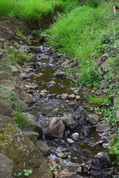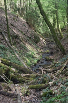 Endlich, nach rund 3 km der Tour, führt uns der Weg in einen Wald und so langsam wird die Strecke schön. Links von uns verläuft wieder der Binnbach. Und so folgend wir dem sanften Geplätscher des Flusses. Langsam führt der Weg wieder bergauf.