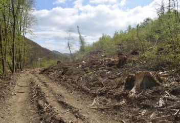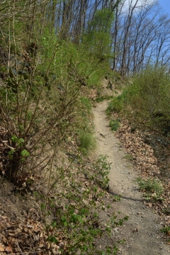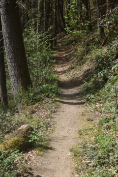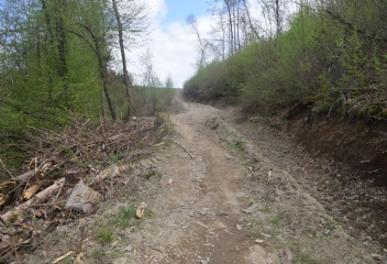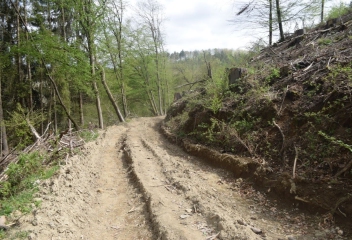 Das Wegstück, was nun vor uns liegt, lässt mich zweifeln, ob wir richtig sind, aber ja, doch tatsächlich, hier geht der Weg lang. Wir wissen nicht, was hier mit dem Weg passiert ist, aber wir fühlen uns wie die ersten Menschen, die nach einem Hurricane zurückkehren. Um uns herum steht kaum noch ein Baum, sondern alles liegt in Kleinholz auf den Hängen rechts und links. Dazu kämpfen wir uns auf dem Weg durch die tiefen Spurrillen von vermutlich Traktoren, die das Totholz abholen. Dieser knappe Kilometer der Tour ist echt eine Zumutung und hat für uns nichts mit einem Prädikatswanderweg zu tun. Das ist hoffentlich nur eine Momentaufnahme und wird sich in einigen Wochen wieder ändern, aber so (Stand: April 2020) ist es wirklich kein schöner Anblick.