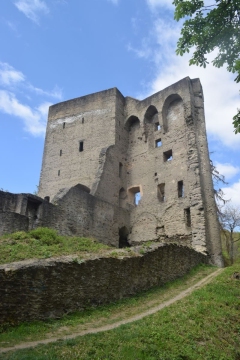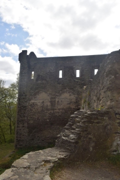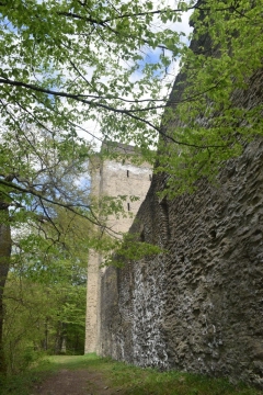 Nach einer kleinen Pause im Innenhof der Burgruine geht es bergab – begleitet von dem lauten Kreischen einer Kettensäge. Es ist einfach nicht unser Tag!