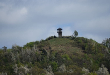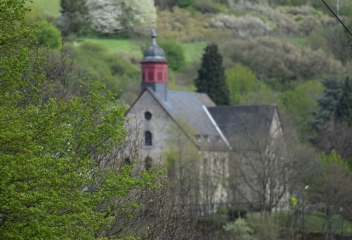 Leider stellen wir danach fest, dass es doch noch ein Stück weiter bergauf geht 😀 Etwa 30 Höhenmeter fehlen uns noch bis wir dann endlich ganz oben sind. Immerhin werden wir mit einer Aussicht auf die katholische Kirche von Arzbach belohnt. Gegenüber auf dem Hügel erspähen wir einen Römerturm, der am ehemaligen Limeswall steht.