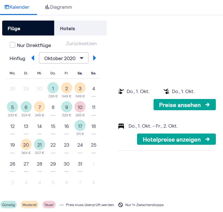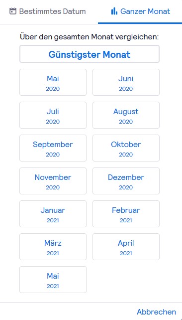 Tip: Wählt bei der Suche keinen festen Zeitraum. Wenn ihr auf das Feld mit dem Hinreisedatum klickt, bekommt ihr neben einem Kalender zum Auswählen eines exakten Datums auch die Option „ganzer Monat“ angezeigt. Bei dieser Option bekommt ihr für euer Reiseziel besonders günstige Hin-und Rückflüge grün markiert.