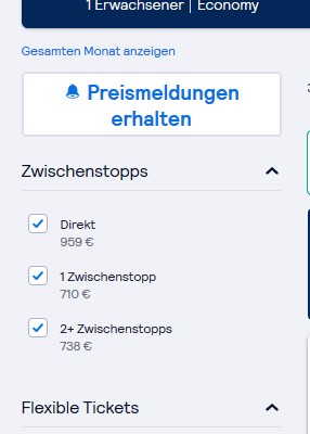 Solltet ihr noch nich mit dem Preis zufrieden sein so könnt ihr euch über den Button: Preismeldungen erhalten einen Reminder setzen der euch benachrichtig, wenn der Preis für euren Flug gefallen ist.