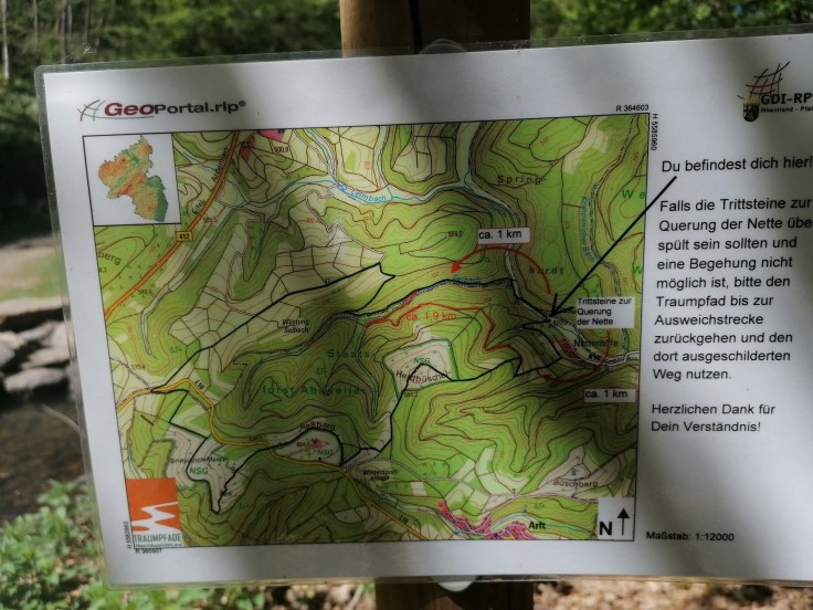 Achtung: Sollte es in den letzten Tagen stark geregnet haben, so habt ihr hier die Möglichkeit nach links zu gehen und einer Umleitung zu folgen, da die Trittsteine über die Nette bei Regen oder nasser Witterung nicht passierbar sind. Die Umleitungen sind aber ebenfalls ausgeschildert. (s. Bild weiter unten im Text).