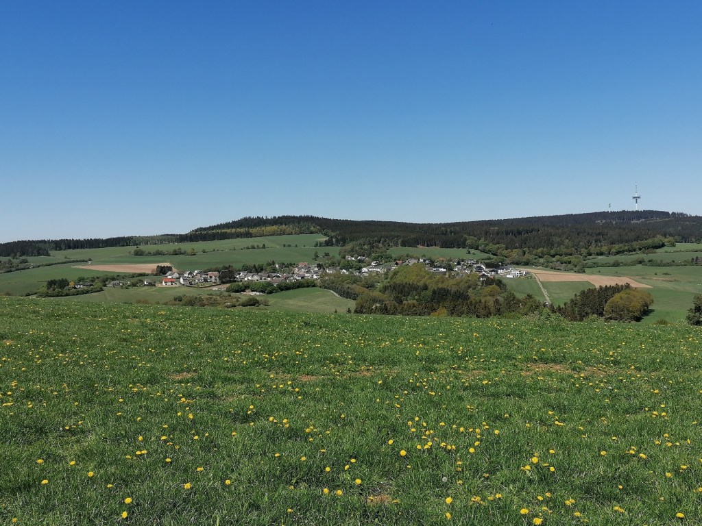 Etwas unvermittelt endet nach etwa 50 überwundenen Höhenmeter der Wald und wir stehen auf einem Schotterweg während sich links eine große grüne Wiese ausbreitet. Wir folgen dem Weg bis zu einer T-Kreuzung, wo wir nach links abbiegen. Von hier hat man einen herrlichen Ausblick auf das links von uns liegende Nettetal und rechts von uns auf das Dörfchen Hohenleimbach.