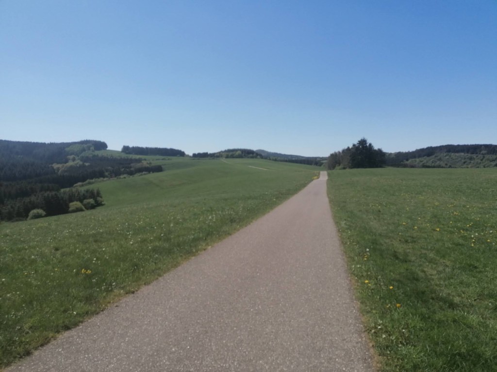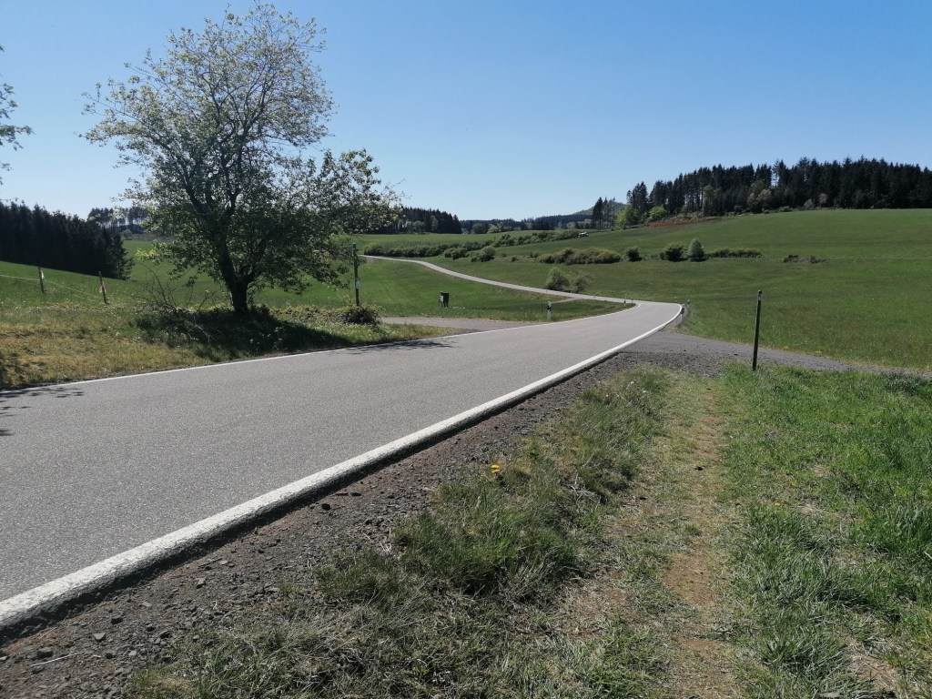 Auf einer Streckenlänge von etwa 1,5 km führt hier ein breiter Asphaltweg ziemlich geradeaus zwischen den grünen Wiesen lang. Wir müssen zugeben, dass sich das Stück ehrlich gesagt etwas in die Länge zieht. Wer auf diesem Wegstück eine Rast einlegen möchte, findet rechterhand die Schutzhütte „Auf der Selbach“. Nach etwa 20 Minuten erreichen wir wieder Wald und sind darüber auch ganz glücklich. So ohne auch nur einen Hauch von Schatten merkt man die Sonne doch auch schon Anfang Mai recht deutlich.