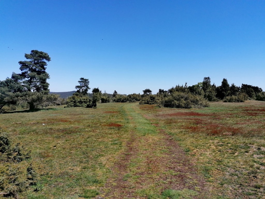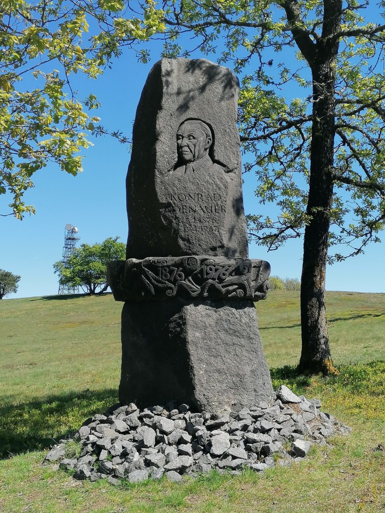 Der Weg führt weiter durch Wälder bevor wir erneut die L10 überqueren. Auf der anderen Seite befindet sich rechterhand ein Konrad-Adenauer-Denkmal. Wir fragen uns, warum dieses Denkmal hier steht. Eine Infotafel wäre an dieser Stelle sehr willkommen gewesen. Später lesen wir im Internet nach und erfahren, dass Adenauer zur Unterstützung der besonderen Heidevegetation eine Geldspende tätigte, die die erforderliche Beweidung durch Schafsherden finanzieren sollte.
