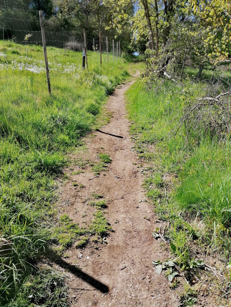 Nach einiger Zeit wird der breite Weg deutlich schmaler und der Abstieg deutlich steiler. Dieses Teilstück hat unserer Meinung nach eher den Schwierigkeitsgrad „Mittel“ verdient. Zwischen Kiefern und Apfelbäume geht es bergab bis wir nach einigen Metern förmlich auf einen breiteren Weg rutschen.