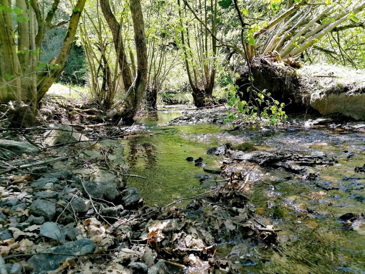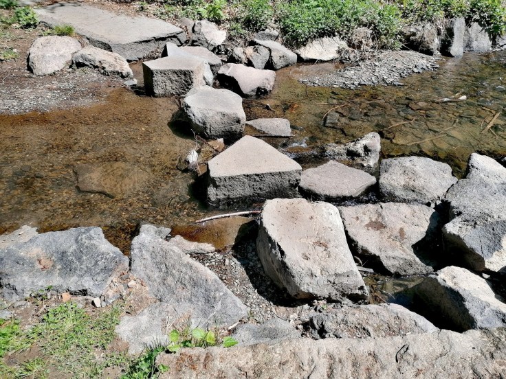 Etwas abseits der Nette, aber parallel dazu, verläuft der Traumpfad weiter. Plötzlich stehen wir direkt vor einem anderen Bach, der unseren Weg kreuzt, bevor er rechts neben uns in die Nette mündet – wir sind auf den Selbach gestoßen. Direkt am Bachufer lädt eine Picknickbank zum Verweilen ein. Wir rätseln derweil lieber, wie wir den Bach überqueren sollen, da es hier keine einladenden Trittsteine gibt. Ein Glück ist das Wasser auch hier relativ seicht, sodass uns kleinere Steine im Wasser ausreichen um auf die andere Seite zu kommen.