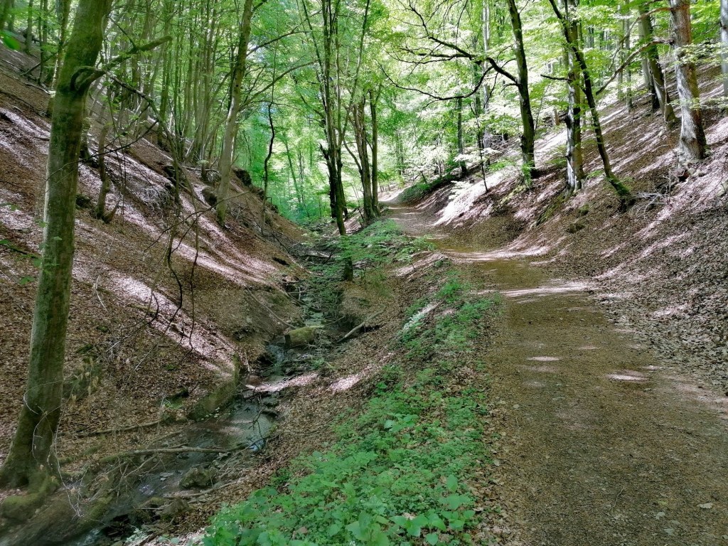 Der Traumpfad führt nun nach links und somit am Selbach entlang. Hier geht es langsam auch wieder bergauf. Eine ganze Zeit lang begleitet uns der Selbach ein gutes Stück unter uns während wir auf einem breiten Waldweg die vor uns liegenden Höhenmeter bestreiten. Dann geht der Traumpfad an einer vor uns liegenden Weggabelung rechts ab und der Anstieg wird noch mal etwas steiler.