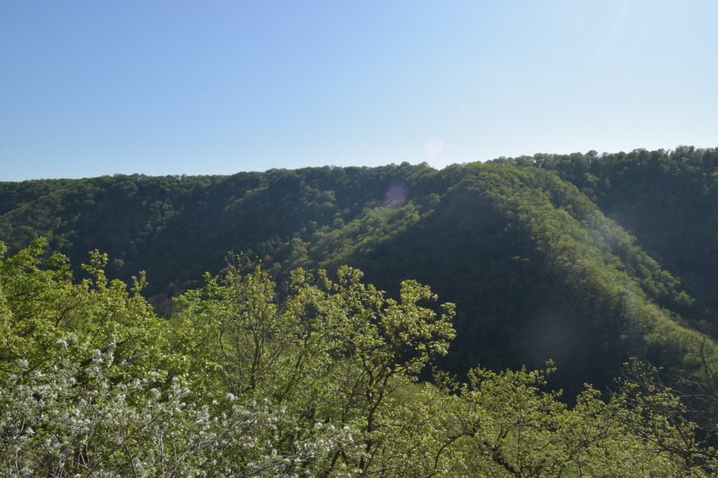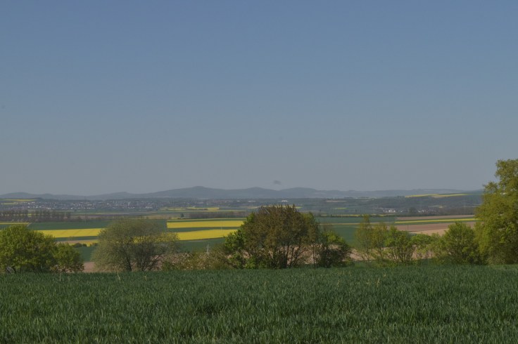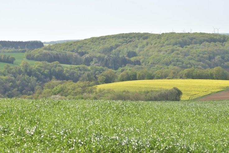 Irgendwann verlassen wir das beruhigende Grün des Waldes und der Weg führt uns durch die Felder. Aber ein Glück ist es Dank der Getreidefelder auch hier herrlich Grün. Während wir durch die Felder Richtung Wierschem Wandern begleitet uns ein wirklich pfeifender Wind und viele Auroraflatter. Leider wollte sich keiner fotogen irgendwo am Wegesrand niederlassen. Dafür entdecken wir drüben im Tal die Burg Pyrmont. Dank der klaren Sicht können wir heute Münstermaifeld und sogar bis zu den Vulkanen schauen, die Maria Laach und den Laacher See eingrenzen.