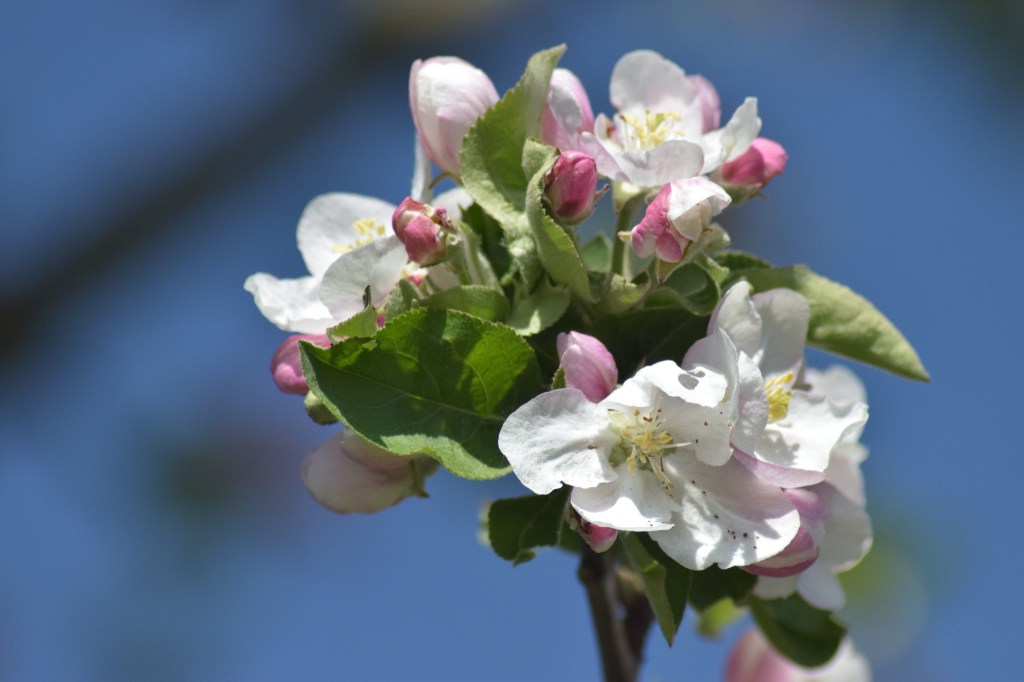 Der Weg führt uns wieder aus dem Wald und es geht über asphaltierte Straßen mit ganz sanftem Anstieg entlang an herrlichen Apfelbäumen, die gerade blühen. Zusätzlich begleitet uns das fröhliche Gezwitscher eines Buchfinkes.