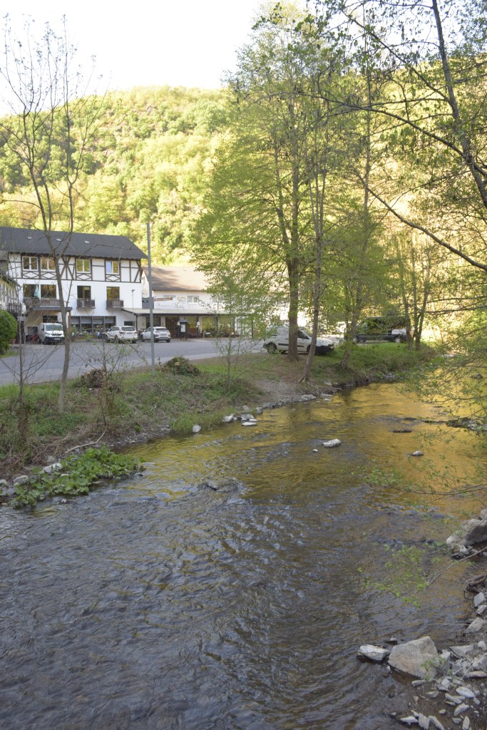 Wieder im Elzbachtal angekommen, treffen wir natürlich wieder auf den Elzbach. Nachdem wir diesen auf einer breiten Brücke überquert haben, führt der Weg vorbei am Landhotel Ringelsteiner Mühle.
