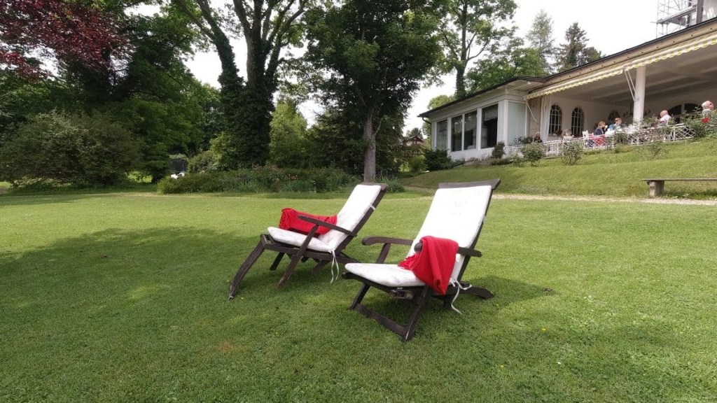 Bevor wir aber schon wieder abreisen, genießen wir noch eine Tasse Kaffee in den einladenden Holzliegestühlen im Park.