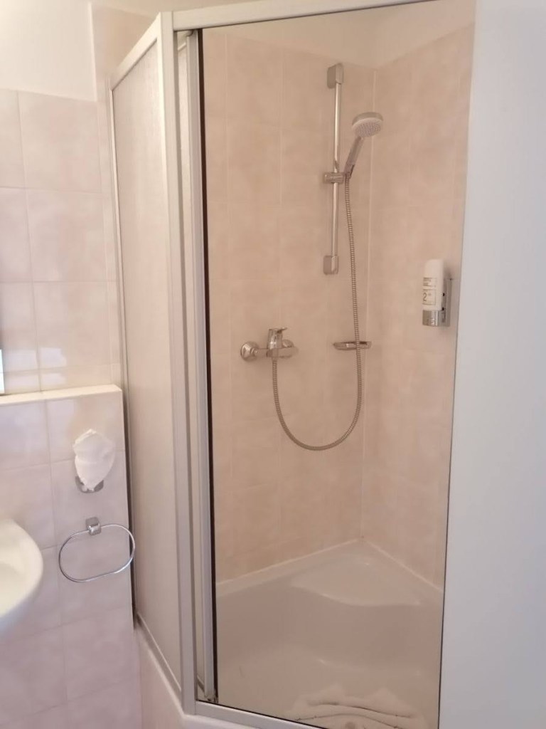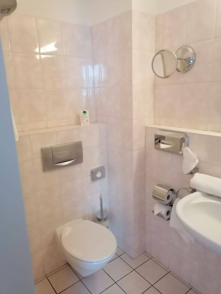 Die Zimmer sind stilvoll, nicht modern, nicht Landhaus…stilvoll im Sinne eines Grandhotels. Es herrscht Rosa vor in unserem Raum, der Kerzenleuchter an der Decke trägt imitierte Wachskerzen. Alles ist sehr sauber und geschmackvoll. Das Zimmer ist für ein normales Doppelzimmer ausreichend groß. Als wir Eintreten ist die Verbindungstür zum unbenutzten Nachbarzimmer noch offen und wir nutzen dies, um uns auch hier den entsprechenden Stil anzuschauen. Auf den Bilder sind Ausschnitte aus beiden Zimmern zu sehen. Vermutlich durch die Verbindungstür war das Zimmer leider auch sehr hellhörig. Dies mag aber auch der historischen Bausubstanz geschuldet sein.