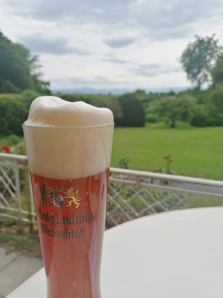 Da es schon Mittag ist bis wir unser Zimmer ausgiebig inspiziert und ausgepackt haben, entschieden wir uns für eine Erkundungstour durch das Hotel. Als wir die große Terrasse mit dem herrlichen Blick auf den See, das Alpenpanorama und den hoteleigenen Park sehen, sind wir begeistert. Wir verstehen nun, warum wir immer wieder die Bezeichnung „Terrassengasthof“ lesen. Ich genieße meine köstliche Nockerlsuppe (6,50€), während Uschi neben mir glücklich einen selbstgebackenen Käsekuchen (5,00€) mümmelt. Umflutet werden dabei von einem herrlichen Lavendelduft, da direkt neben unserem Tisch ein großer Lavendelstrauch sitzt.