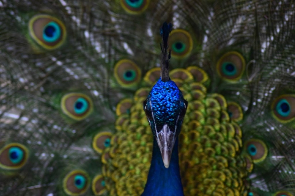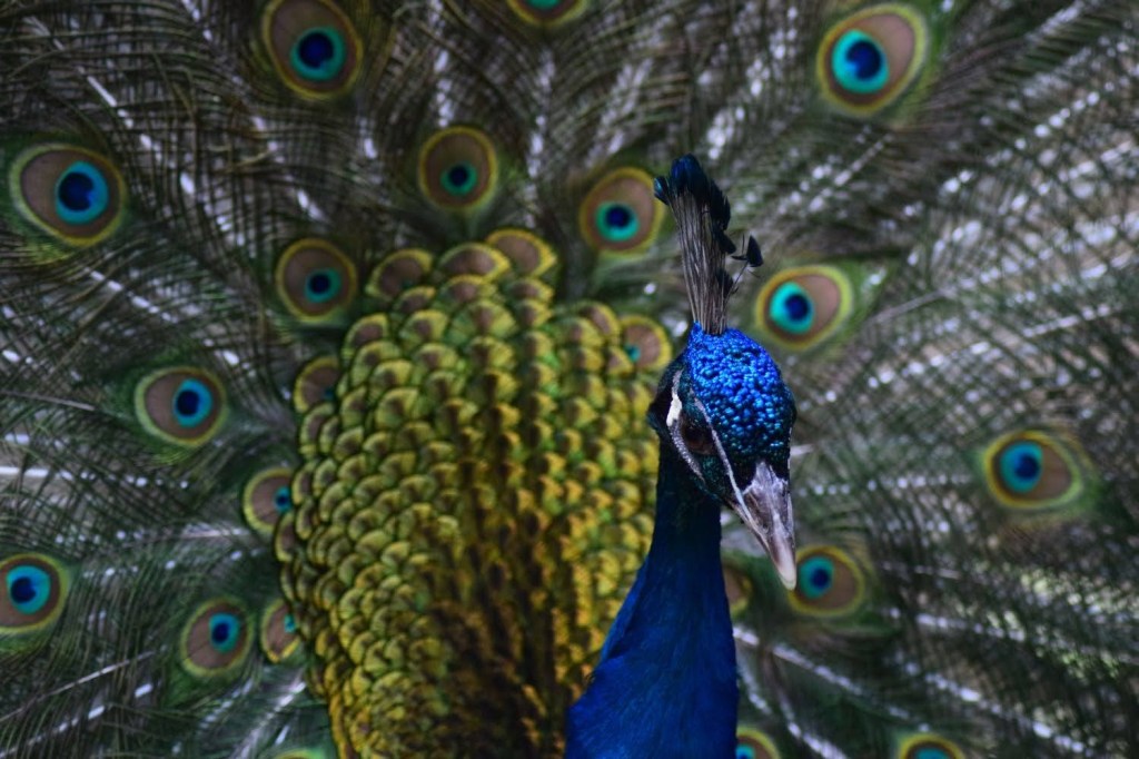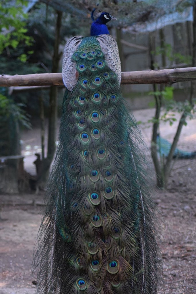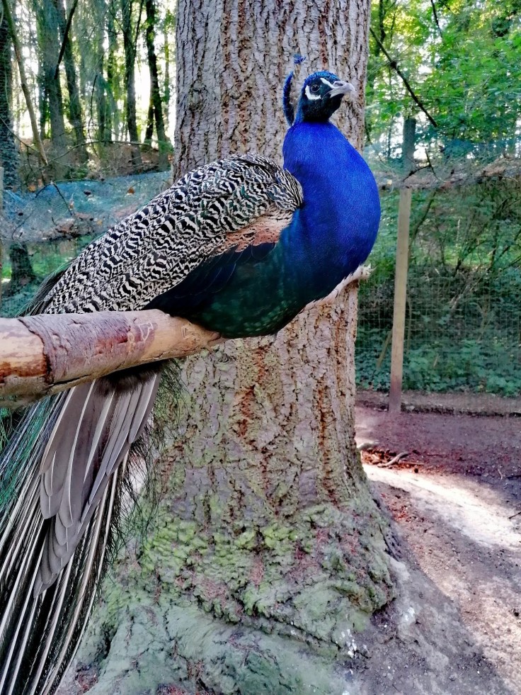 Ein leichter Ansteig führt und nun endlich zu den Gehegen, die wir vorhin schon gehört haben – die Volieren. Wir haben großes Glück – ein Pfauenhahn hat gerade ein Rad geschlagen und versucht ein Weibchen durch seinen Balztanz von sich zu überzeugen.