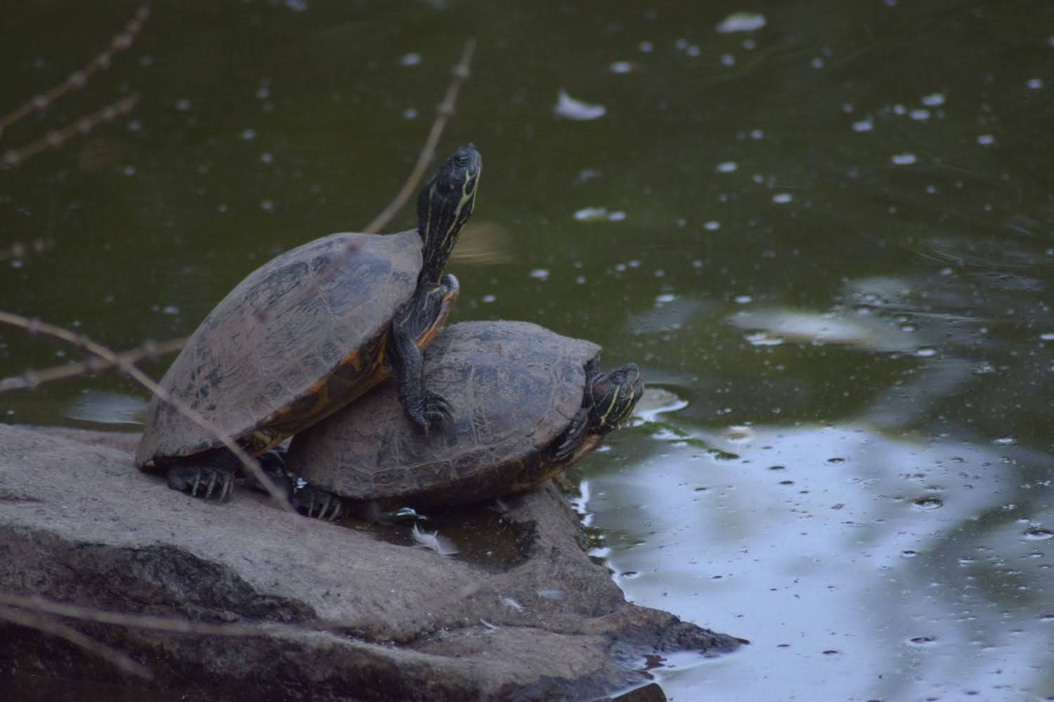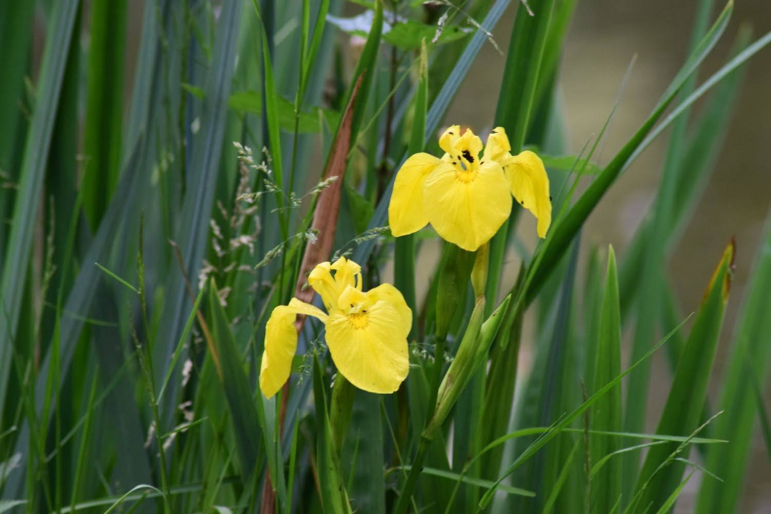 Als nächstes kommen wir zu einem Teich. Hier zeigen sich uns bis auf zwei Schildkröten, die fast versteinert wirken, und ein paar Fischen leider kaum Tiere. Dafür ist der Rand wenigstens gesäumt von gelben Sumpfschwertlilien.