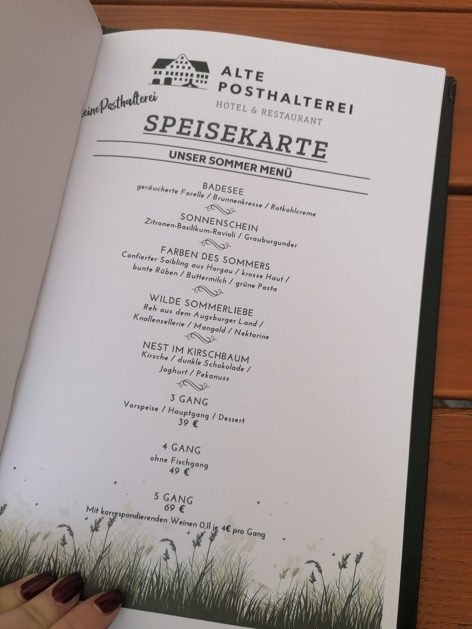 Damit ihr einen Eindruck von den Restaurantköstlichkeiten erhalten könnt, haben wir euch einfach mal die Speisekarte abfotografiert. Achtung – da hier, wie gesagt, auf saisonale und regionale Produkte sehr viel Wert gelegt wird, wird die Speisekarte häufiger mal geändert…aber so gibt es ja auch immer einen Grund wieder her zu kommen und die neuen Köstlichkeiten auszuprobieren. Aber nicht nur diese beiden Faktoren sind dem Hotel wichtig, sondern auch eine artgerechte Haltung der Tiere und ein umweltbewusstes Handeln.