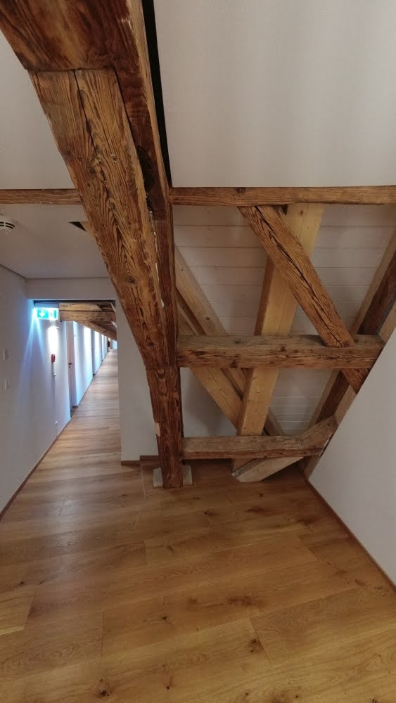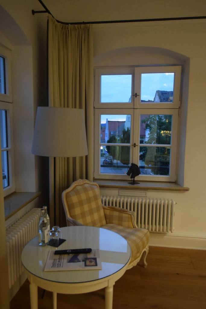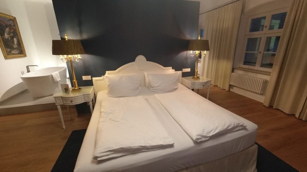 Die Gemälde, die die Hotelflure zieren, gehören bspw. noch in den Originalbestand von 1648. Lange Zeit waren sie eingelagert gewesen und haben nun wieder einen Platz im Hotel gefunden. Oder auch Stücke des Originalmobilars (wie bspw. Bett, Nachtkästchen und Schreibtisch aus unserem Zimmer) haben nach einer Restaurierung durch den Königshof in München wieder einen Platz im Hotel gefunden. Auch der Kalkputz in unserem Zimmer sei wieder original wiederhergestellt worden. Wenn ihr auf dem neu verlegten Eichenparkett durch das Haus wandelt, findet ihr sicherlich noch viele liebevolle Details und Schätze aus alten Zeiten.