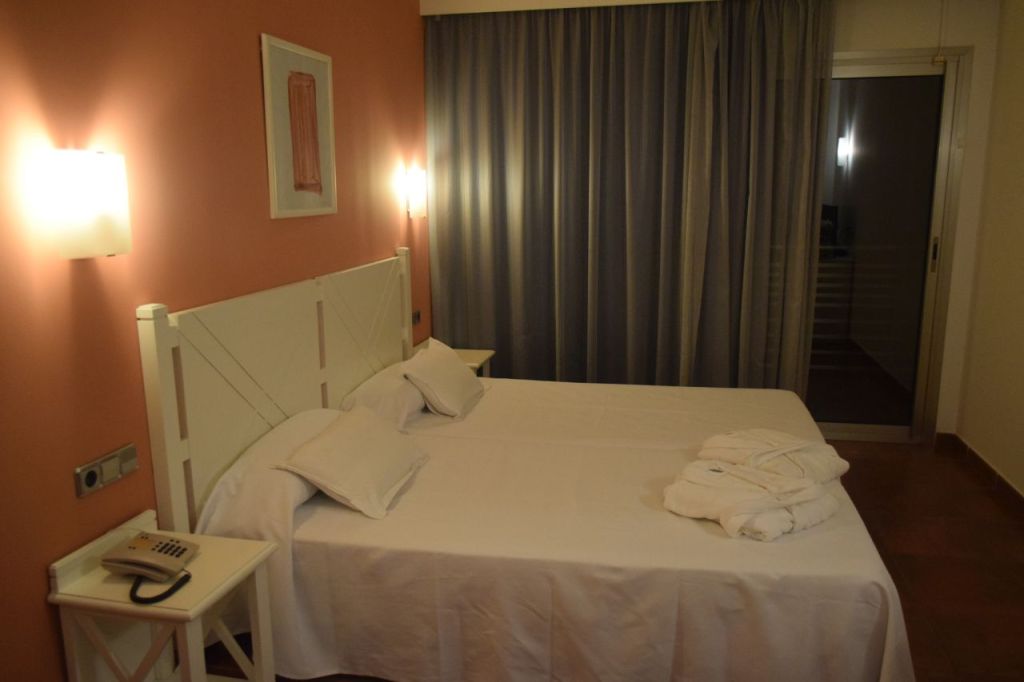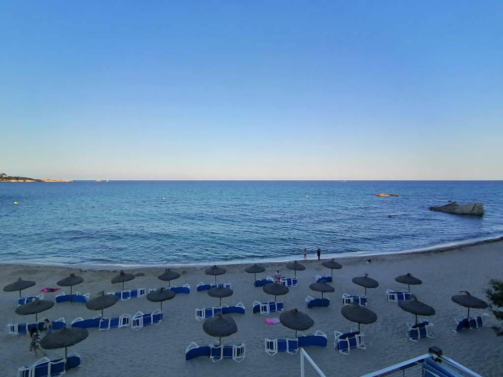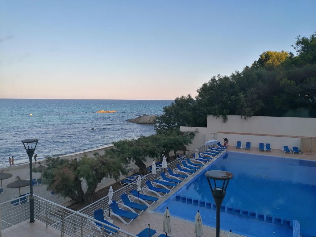 Das Hotel liegt direkt am Strand Son Moll, mit Anschluss an die Strandpromenade. Beim Ausladen fällt uns ein: Ja richtig Maskenpflicht!